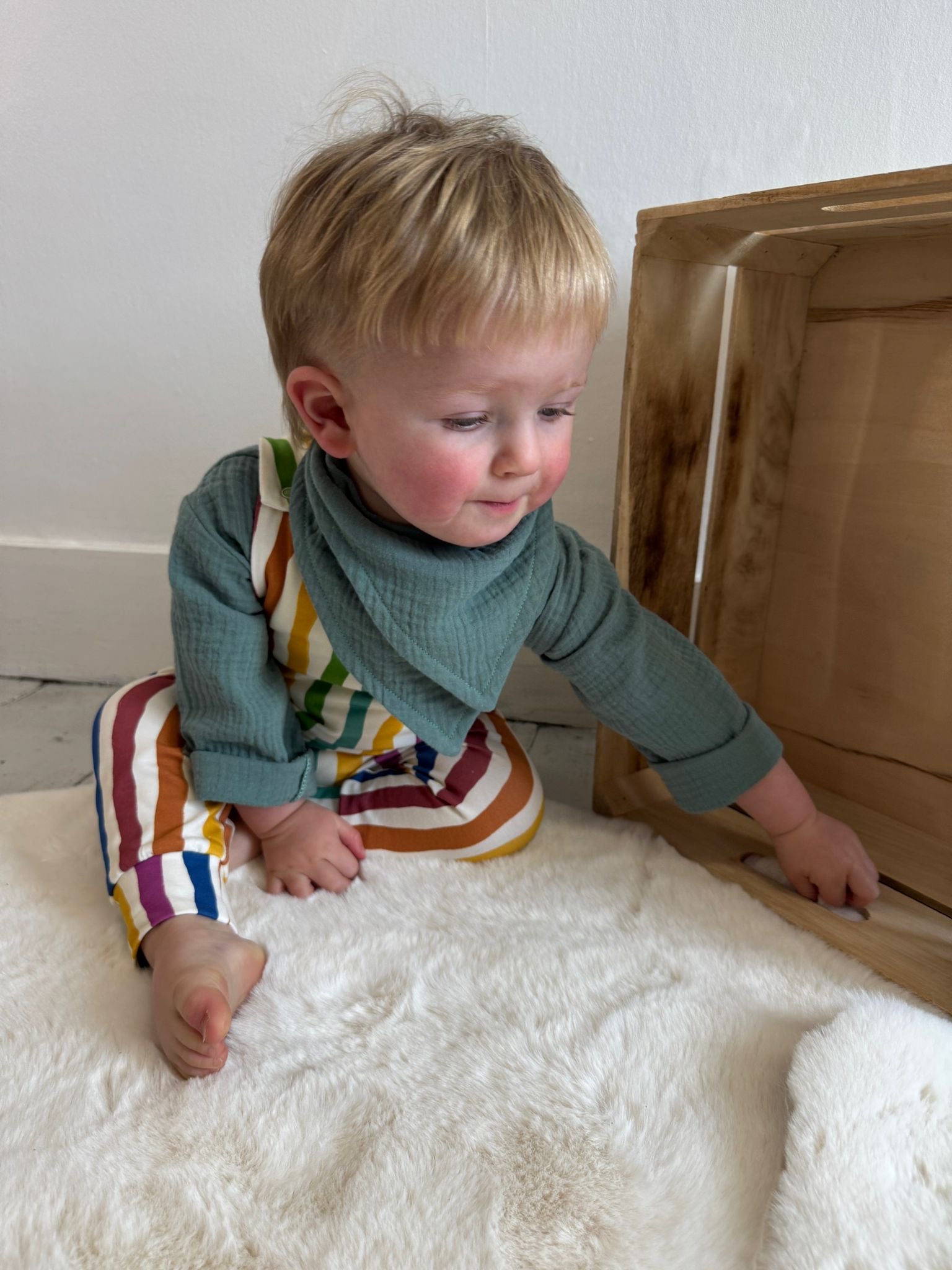 Dribble bibs are made using our signature 100% Organic Cotton Oeko-tex certified double Gauze fabric, which means they are soft and snuggly against little ones' skin. Designed as a folded square, so you can flip it over if needed. They're fastened at the back, with two poppers so that they'll fit tiny babies through to toddlerhood.