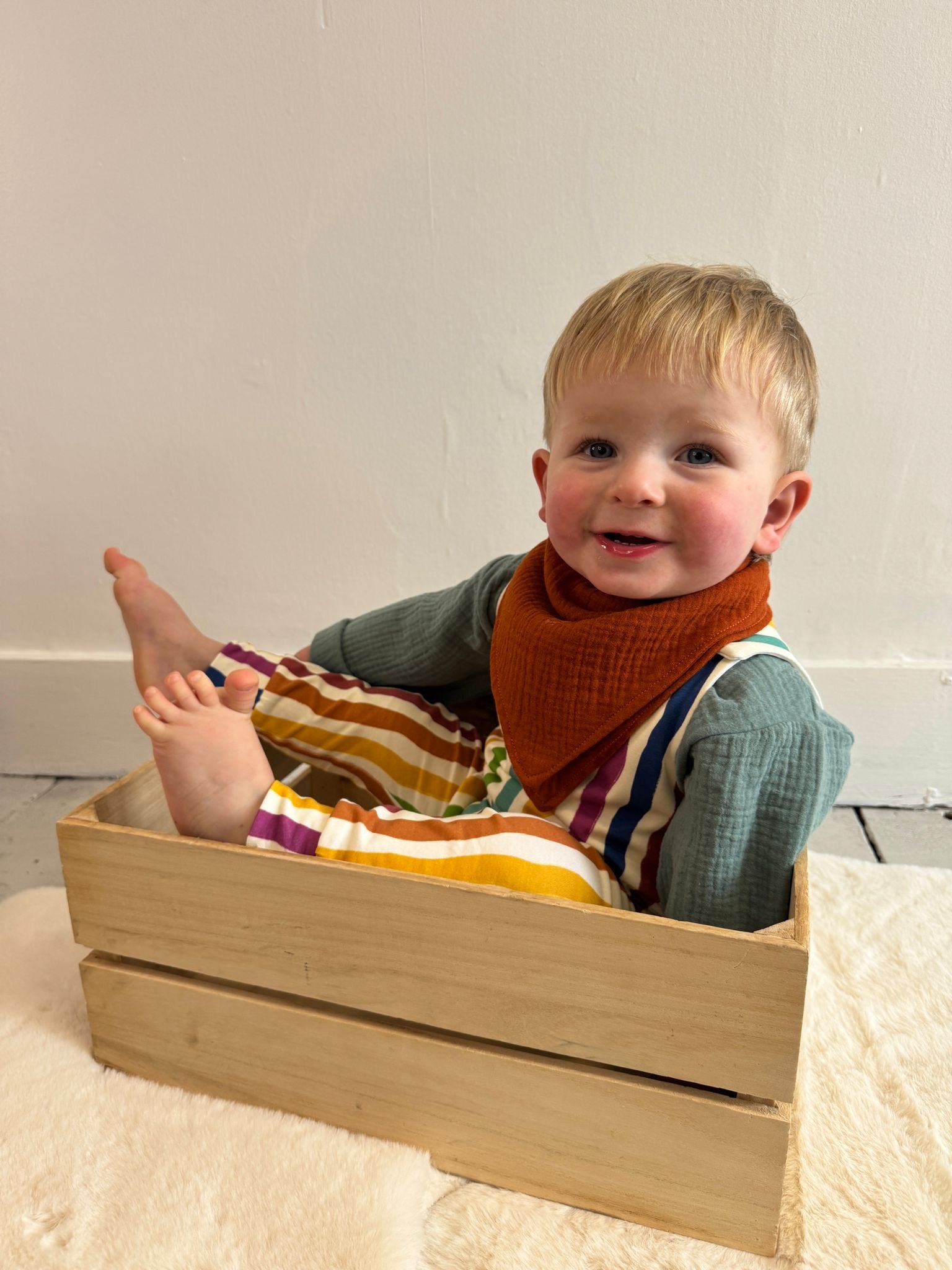 Dribble bibs are made using our signature 100% Organic Cotton Oeko-tex certified double Gauze fabric, which means they are soft and snuggly against little ones' skin. Designed as a folded square, so you can flip it over if needed. They're fastened at the back, with two poppers so that they'll fit tiny babies through to toddlerhood.